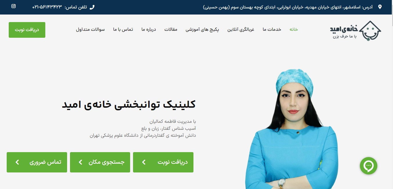 کلینیک توانبخشی خانه ی امید با قابلیت دریافت نوبت، جستجوی مکان و تماس ضروری و خدماتی مانند کاردرمانی ذهنی، یک وب سایت کامل در حوضه درمانی میباشد که توسط تیم گنج دیجیتال طراحی و توسعه داده شده است.